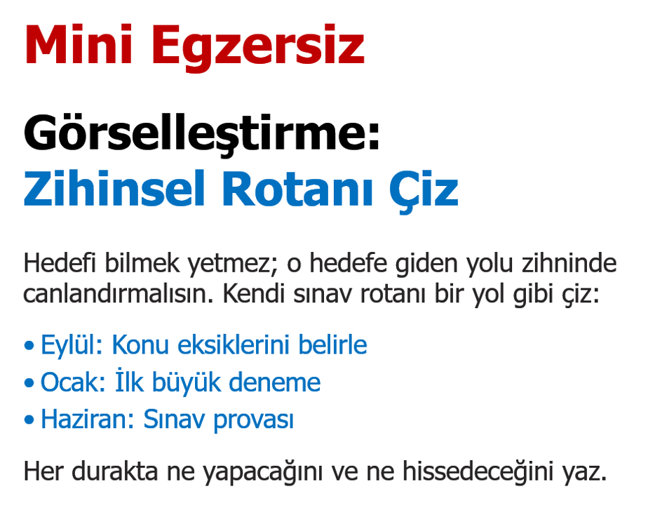 Hedefi bilmek yetmez; o hedefe giden yolu zihninde canlandırmak gerekir. Görselleştirme, öğrencinin içsel enerjisini yönlendirmesine ve her adımda neden yürüdüğünü hatırlamasına yardımcı olur.