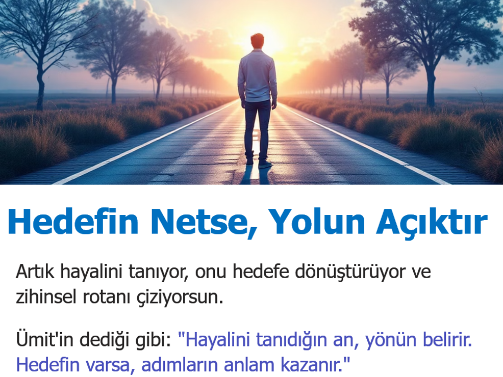 “Hayalini tanıdığın an, yönün belirir. Hedefin varsa, adımların anlam kazanır. Bu yolculukta yalnız değilsin—çünkü her adımında hayalin seninle yürüyor.”