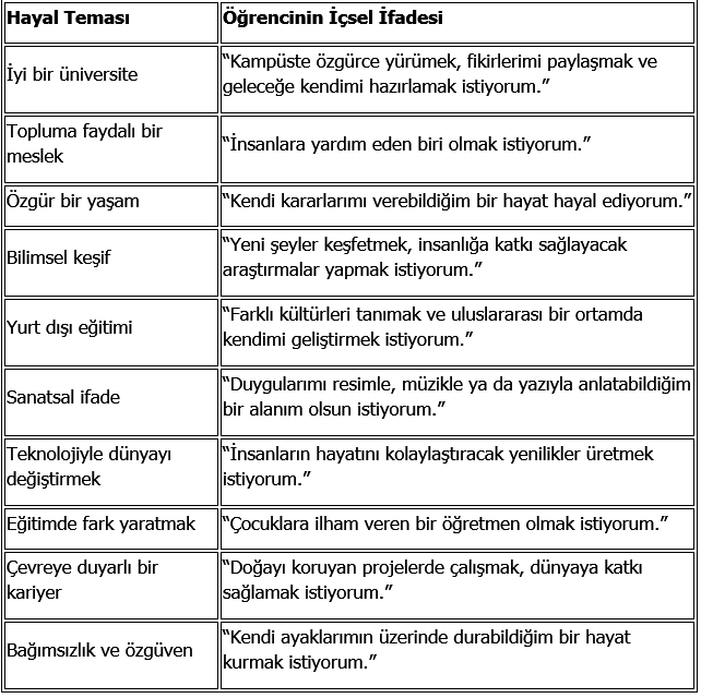 Hayal, öğrencinin içsel dünyasında şekillenir. Genellikle şu temalarda ortaya çıkar: