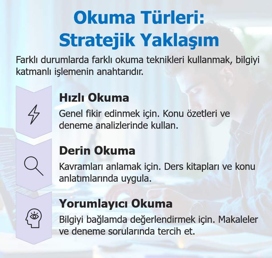 Sınav sürecinde okuma, tek boyutlu bir eylem değildir. Tıpkı bir koşucunun farklı zeminlerde farklı adım teknikleri kullanması gibi, öğrenci de bilgiyle karşılaştığında farklı okuma türlerini stratejik şekilde uygulamalıdır. Hızlı okuma, bu stratejilerin merkezinde yer alır; ancak tek başına yeterli değildir. Bilgiyi anlamak, bağ kurmak ve yorumlamak için okuma türleri arasında geçiş yapabilmek gerekir.