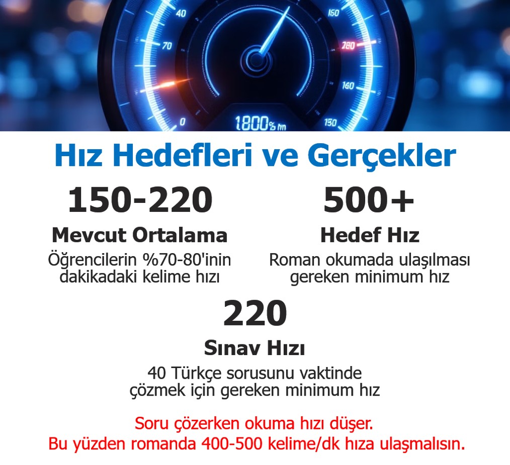 2025 yılı itibariyle üniversite giriş sınavlarının ilk basamak sınavında 40 Türkçe sorusunu vaktinde çözmek için en az 220 kelimelik hızla soru çözmeleri gerekiyor. Öğrencinin bu hızla soru çözebilmesi için romandaki okuma hızının dakikada 400–500 kelimenin üzerine çıkması gerekiyor.