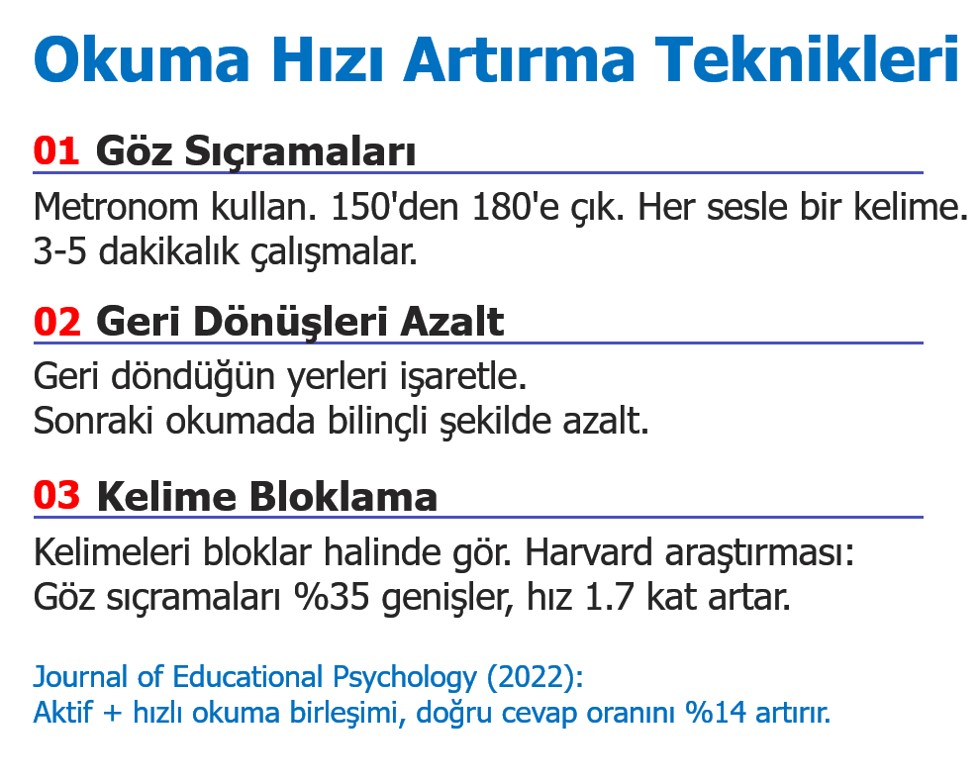 Journal of Educational Psychology (2022) verilerine göre, aktif okuma ile hızlı okuma tekniklerini birlikte kullanan öğrencilerin sınavlardaki doğru cevap oranı %14 daha yüksek çıkmıştır.