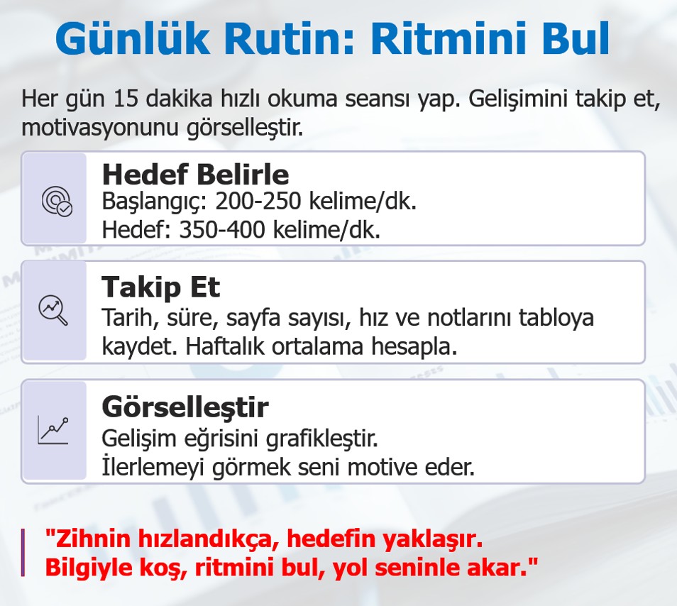 • Her gün en az 15 dakika hızlı okuma seansı önerilir.