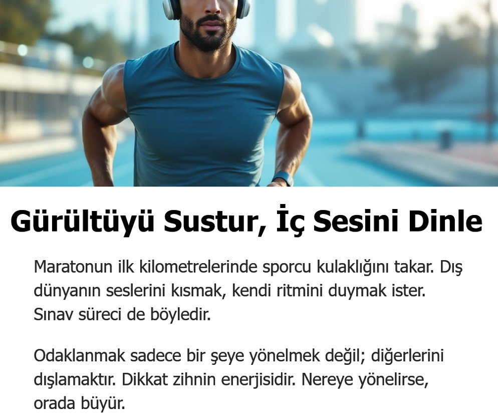 Ümit, maratonun ilk etabında ritmini kurdu. Dikkatini dış seslerden çekti, iç sesine yöneldi. Artık biliyor: odaklanmak, sadece sessizlik değil; seçmek, yön vermek, kendini duymaktır.