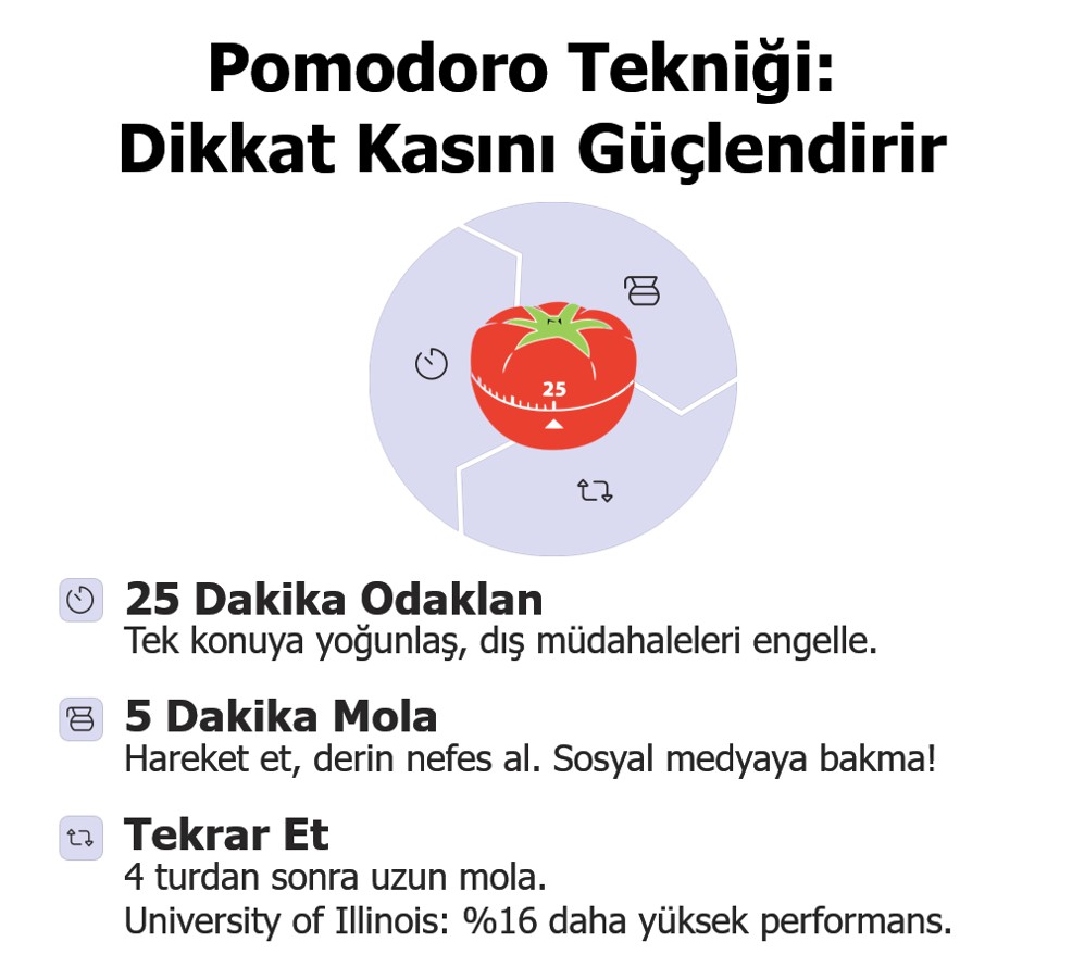 Pomodoro, odaklanma süresini kısa ve yönetilebilir parçalara bölerek dikkat kasını güçlendiren bir tekniktir. Genellikle 25 dakika odaklı çalışma + 5 dakika kısa mola şeklinde uygulanır. Dört turdan sonra daha uzun bir mola verilir.