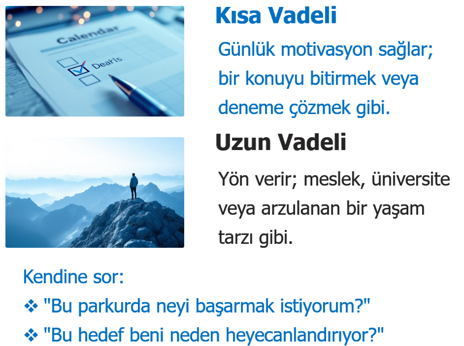 Uzun vadeli hedefler ise — hayal ettiğin meslek, üniversite, yaşam tarzı — sana yön verir.