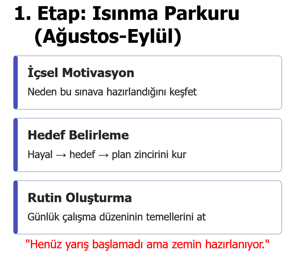 Sınav yılına giriş, tıpkı bir koşucunun yarış öncesi yaptığı ısınma gibidir. Bu dönemde amaç, zihinsel hazırlık yapmak, nedenini keşfetmek ve hedefini netleştirmektir. Öğrenci henüz tam anlamıyla koşmaya başlamamıştır ama zemin hazırlanır, motivasyon şekillenir.