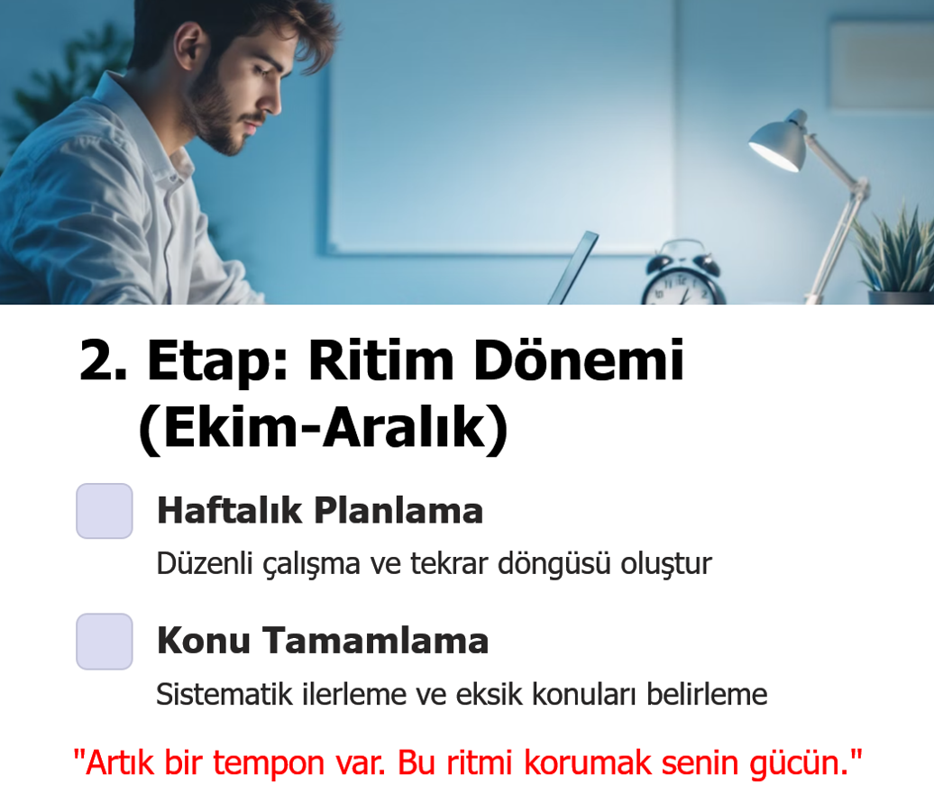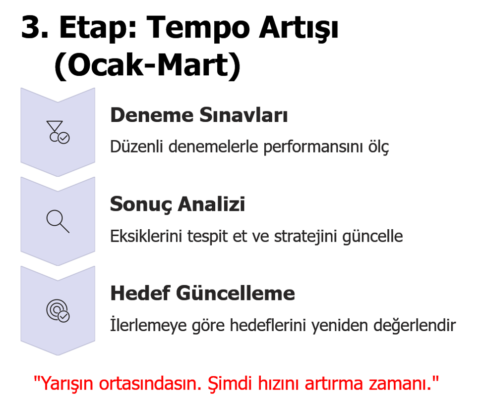 Yarışın ortasına gelindiğinde artık tempo artar. Deneme sınavları, analizler ve geri bildirimler bu dönemin temelidir. Öğrenci, eksiklerini fark eder, stratejisini günceller ve hızlanır.