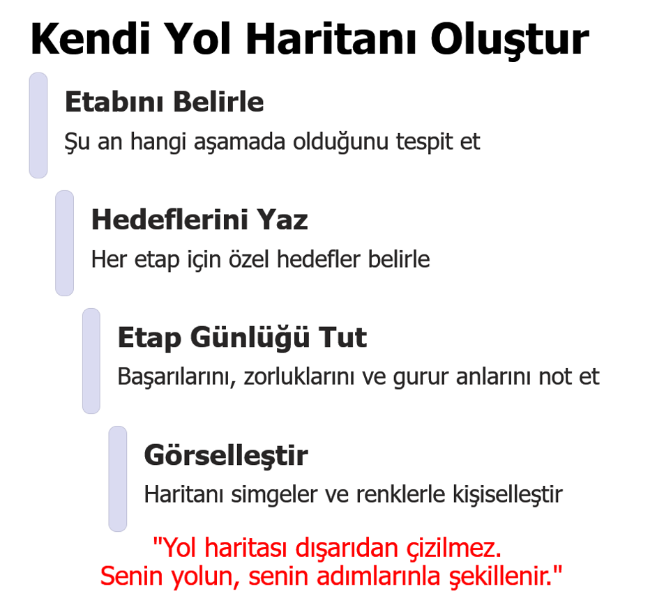 Artık yol haritan elinde. Onu kişiselleştirme zamanı; bu haritayı kendi yolculuğuna uyarla. Çünkü her öğrenci farklı bir rotada, farklı bir hızda ilerler. Önemli olan, kendi yönünü bulmak ve bu yolda bilinçli adımlar atmaktır.