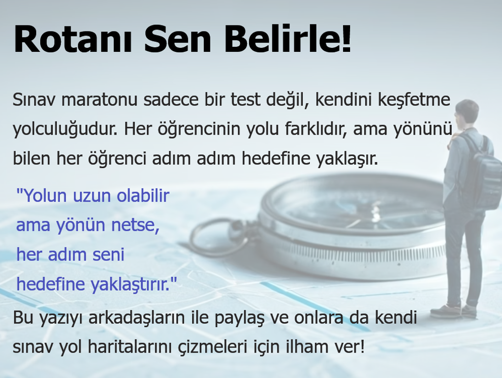 Kendi yol haritanı çiz, etaplarını tanımla, ara hedeflerini yaz ve bu süreci bir keşfe dönüştür. Çünkü bu maratonun sonunda seni bekleyen şey yalnızca bir sınav değil; kendini keşfetmiş, yönünü bulmuş bir sen.
